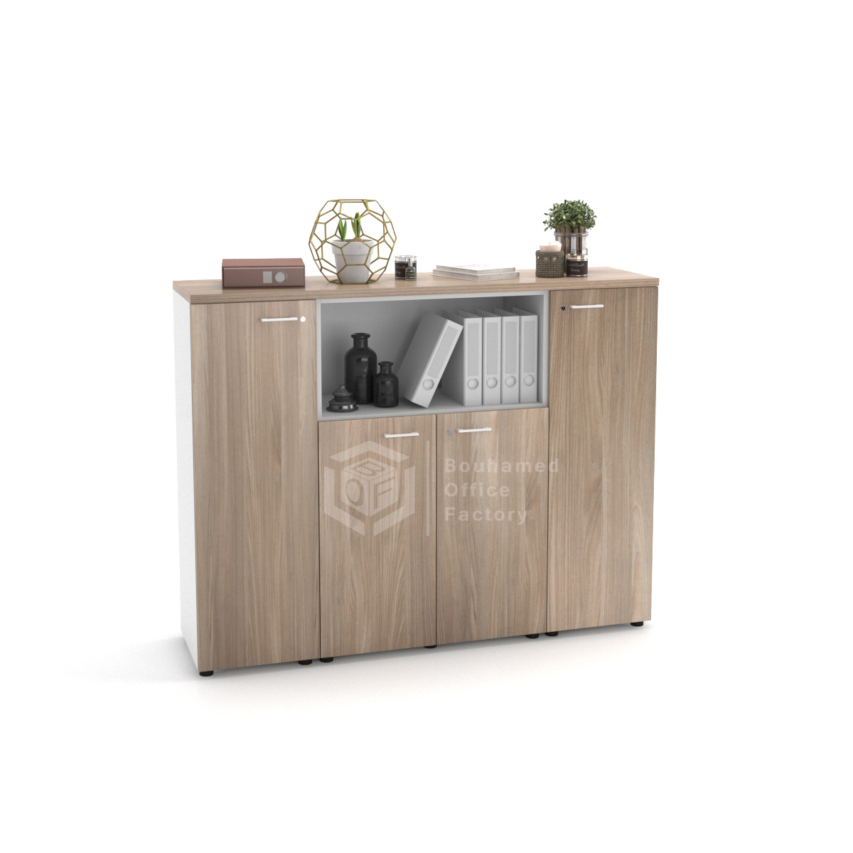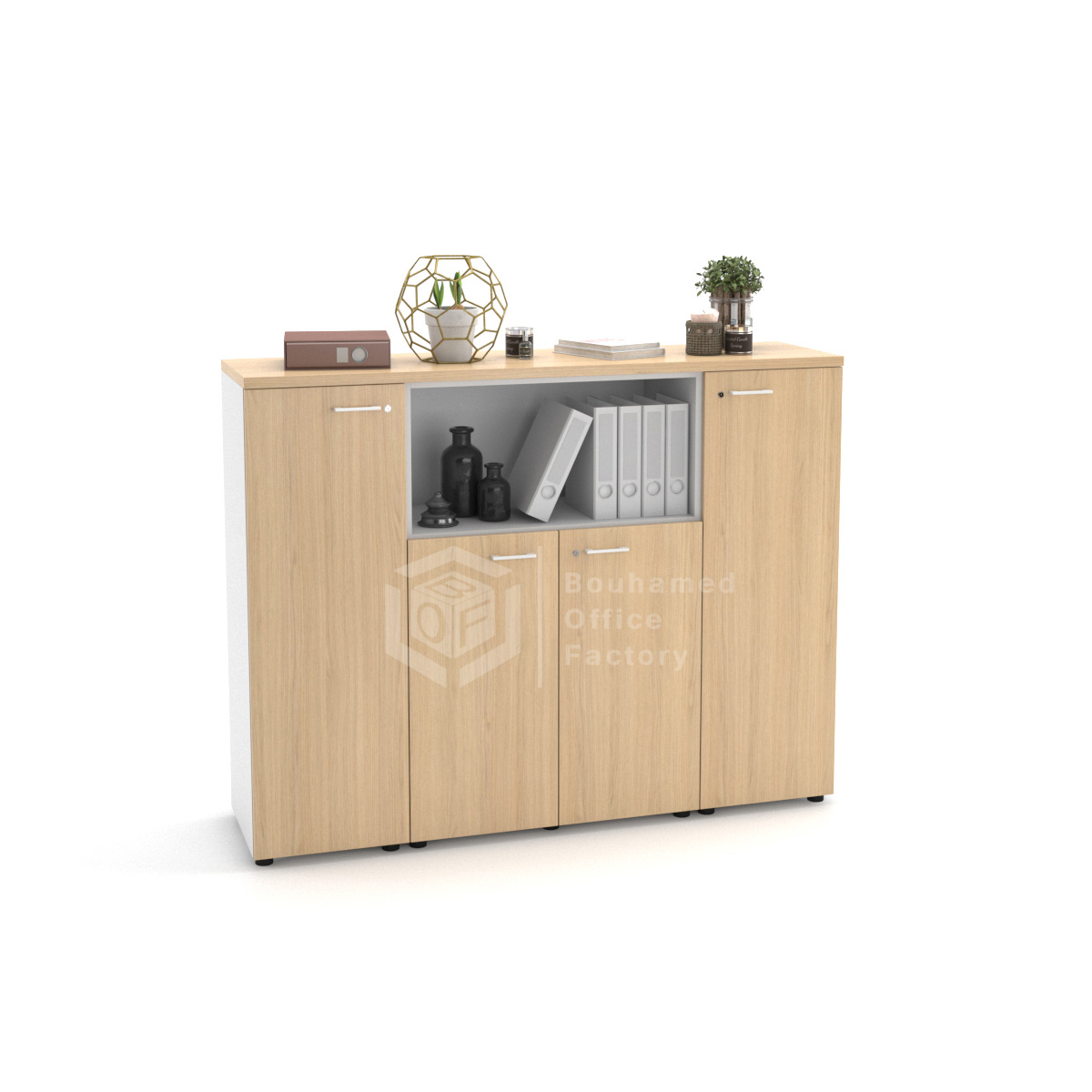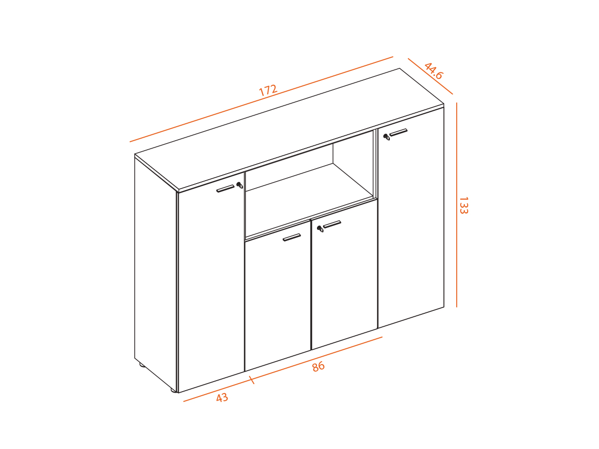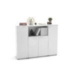 Grâce à la grande modularité des armoires MAGIC, il est possible de créer des combinaisons de meubles de rangements fonctionnels, de différentes dimensions et s’adaptant à tous les besoins. La configuration se compose ici d’une armoire basse à double ouverture de 86 cm de large et de deux portes mi-hautes de 43 cm de large. Une niche ouverte au centre de l’ensemble vous permettra d’y exposer des éléments de décorations, afin d’égayer votre bureau.